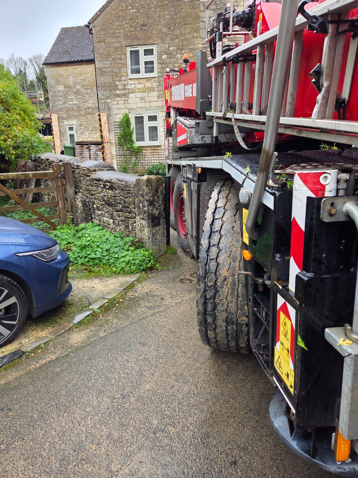 Never a dull moment when operating one of our city cranes. This job which involved the erection of an oak-framed building entailing a particularly tight reverse onto site. Navigating a narrow residential access with very little room to spare in Avening, Nr. Tetbury, Gloucestershire, while it wasn’t the tightest approach we’ve ever handled, it certainly earned a solid 7 out of 10 for difficulty.