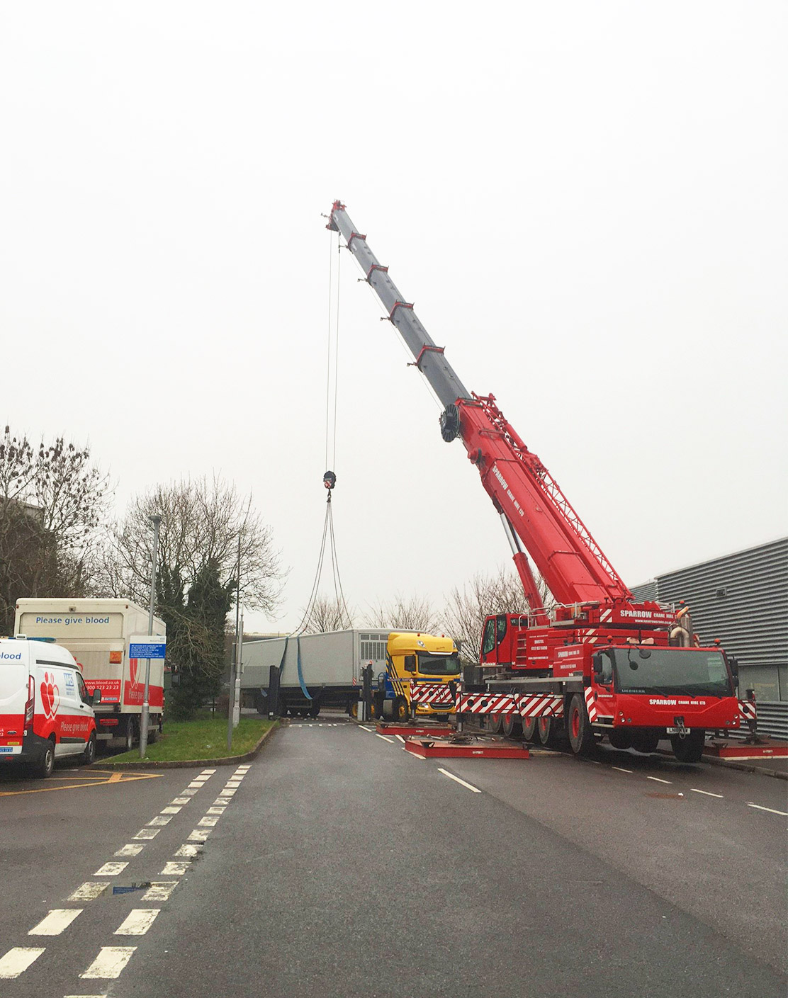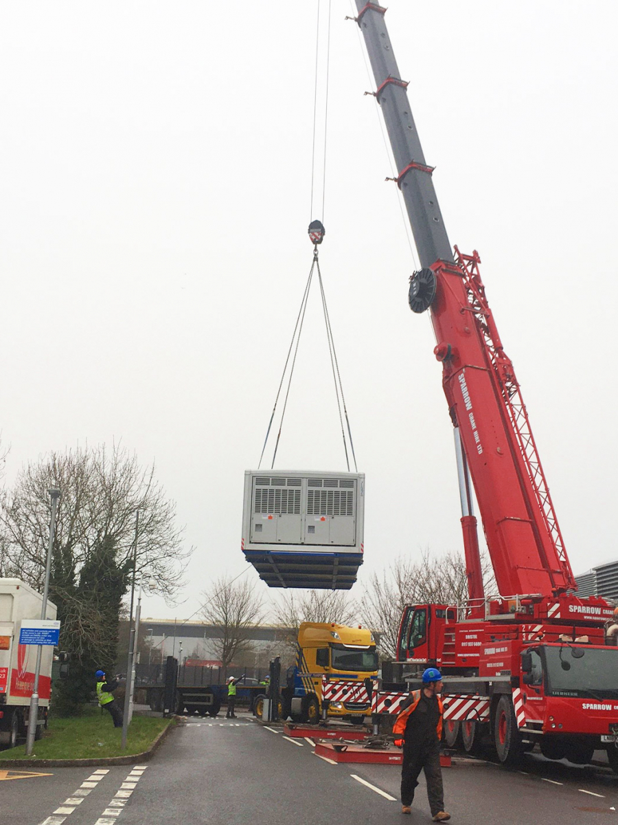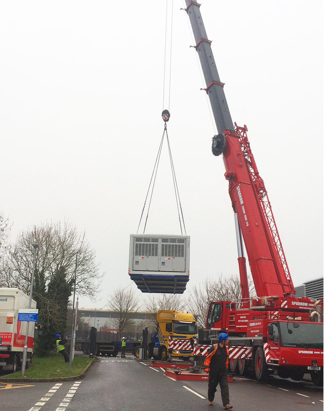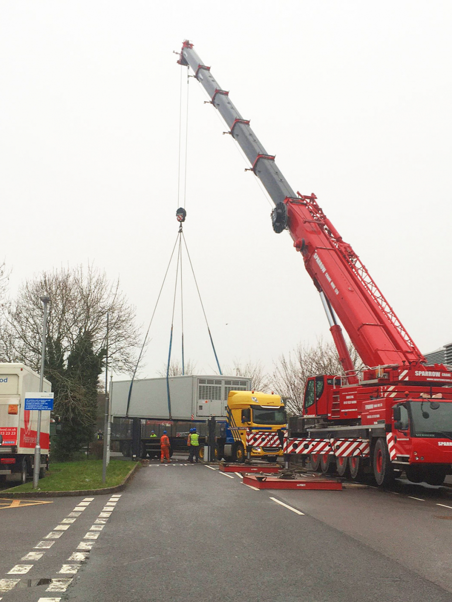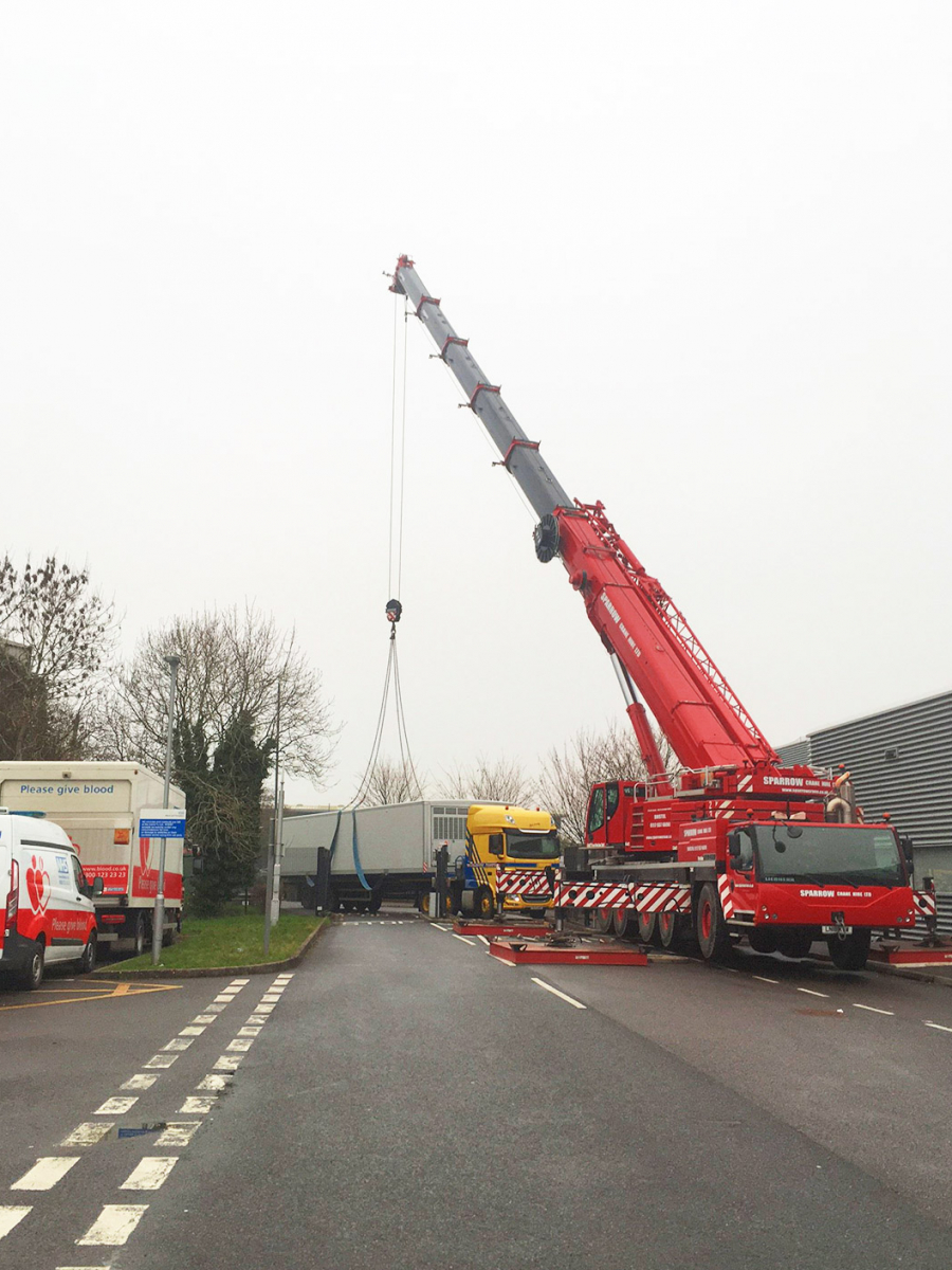 At the weekend the crane featured below was our 200te capacity Liebherr LTM1200 5.1 on 46te counterweight. We were lifting 3 x 15m x 4.2m coldstores over the fence as the transport couldn’t access the site loaded.