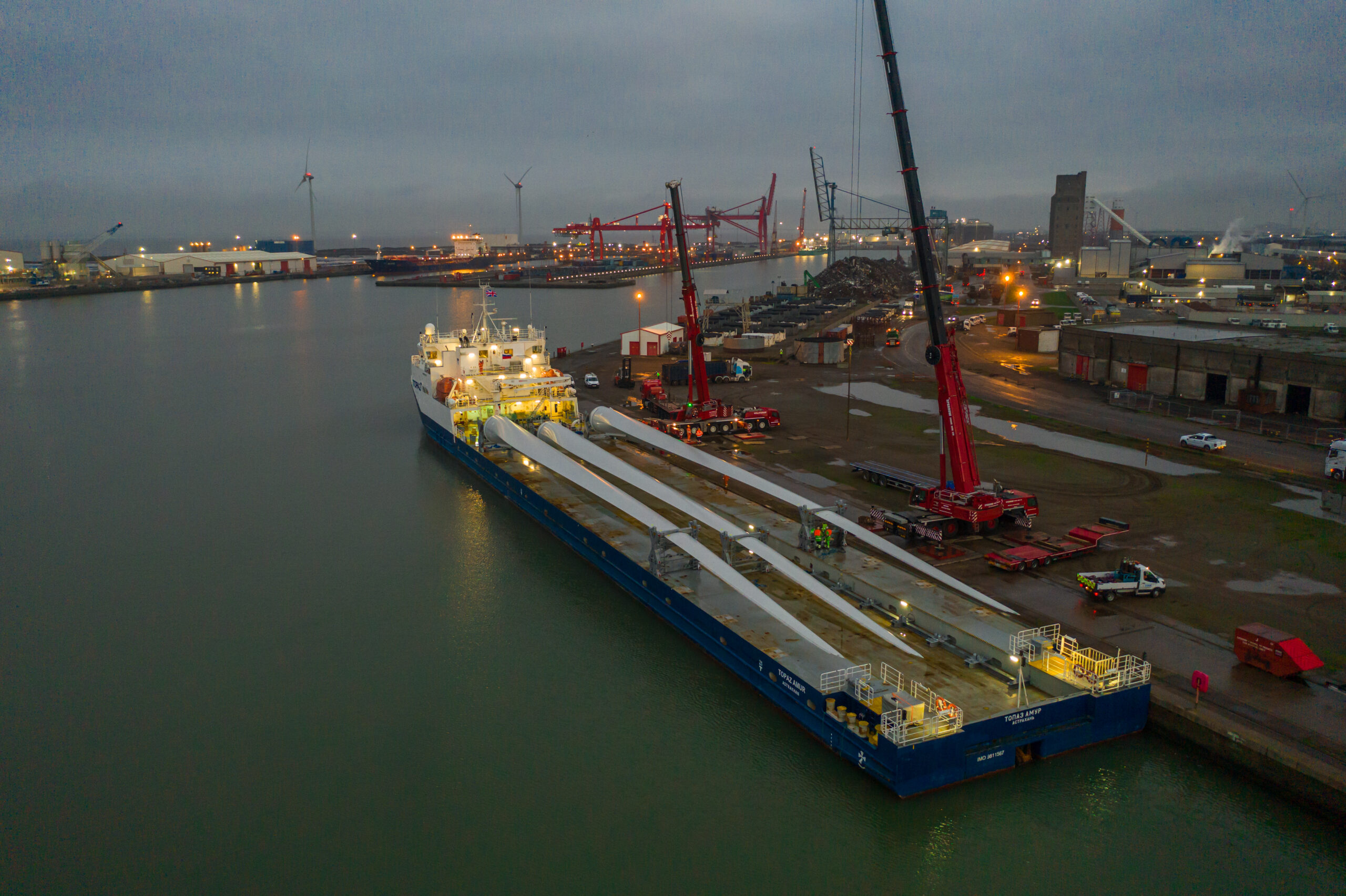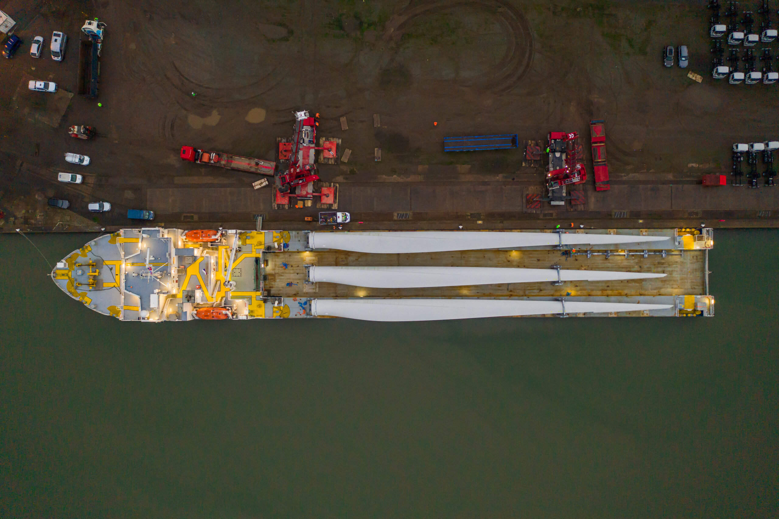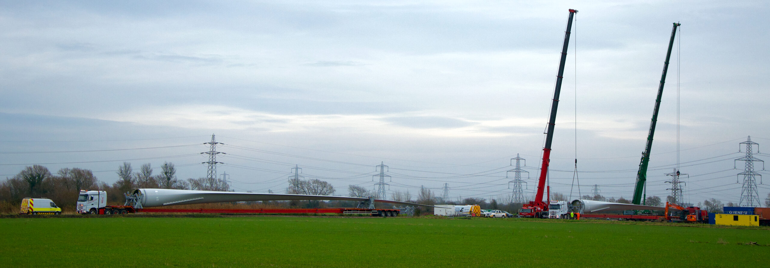 Sparrow Crane Hire asked to assist in the crane lift of the 68 metre in length blades, the impressive sweep area equivalent to two Wembley football pitches, the longest turbine blades in the UK. Hoisted from the ship at Avonmouth Dock Bristol and being transported the remaining 20 miles to Magor, South Wales. To view more about the Wind Turbine crane lift click here